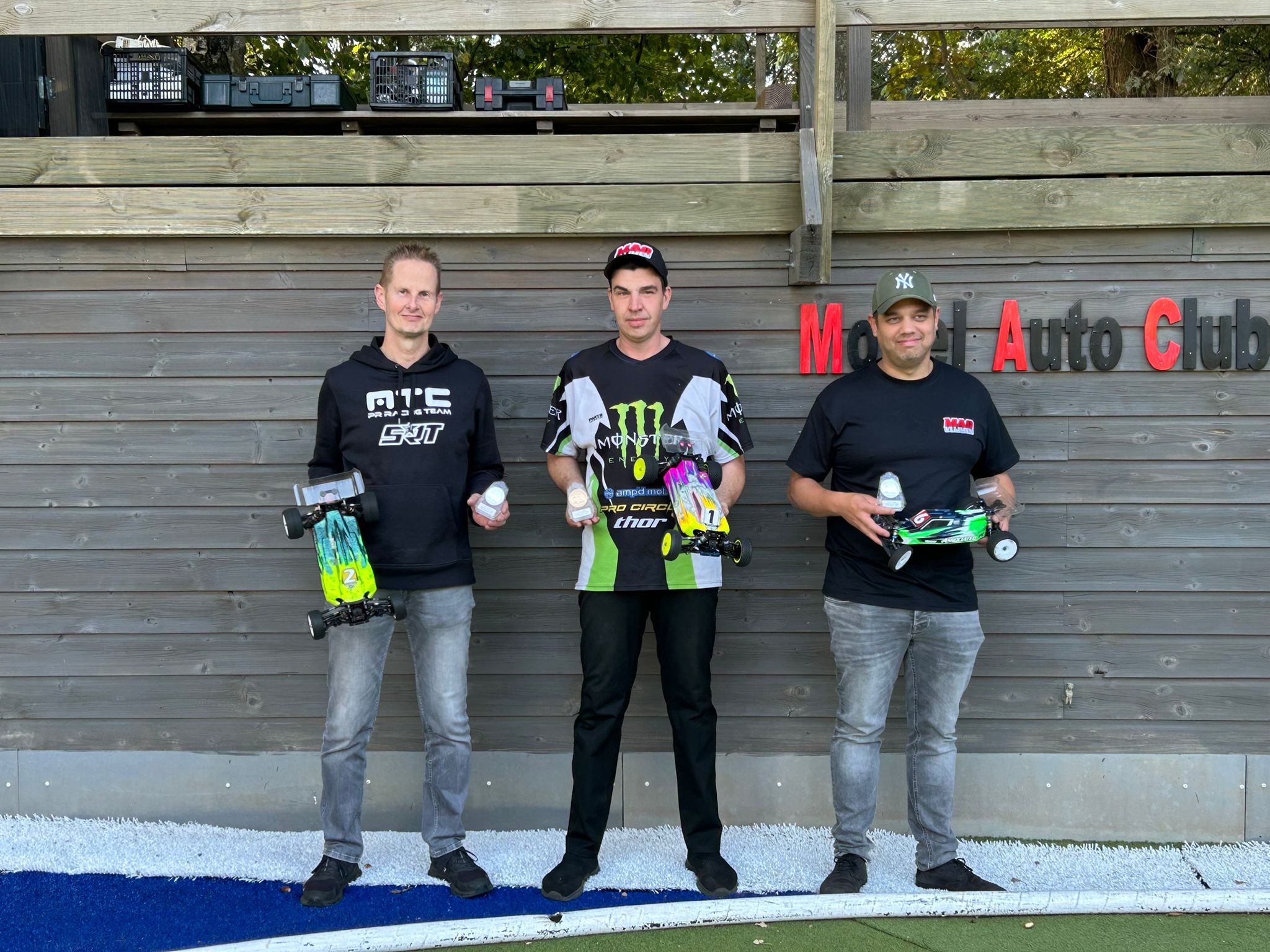 Met ruim 40 geregistreerde coureurs veruit de meest populaire klasse. In het klassement 16 rijders die 4 of meer wedstrijden hebben meegereden. In een top 10 met erg snelle jongens en uiteindelijk Tom die zich 2WD Clubkampioen 2025 mag noemen. Hij heeft er hard voor moeten werken maar na een titanenstrijd met in de eerste helft van het seizoen Jim en in de tweede helft van het seizoen Mike K uiteindelijk de snelste. Een combinatie van pure snelheid, ervaring en de vaardigheid om een auto goed naar zijn hand te zetten hebben de doorslag gegeven. Van harte gefeliciteerd Tom! Jim keurig op P2 met een knappe TQ en win in ronde 2 en een mooi tweede plek in ronde 3. Eppo op P3 met een derde plek in ronde 2, 3 en 5. De top 7 in het kampioenschap is met ronde 5 niet meer veranderd. Op P4 keurig Sander die met zijn B7 een constante snelle factor is vooraan in het 2WD startveld. Ronald na een wat stroeve start bij ronde 1 netjes her-pakt en op P5 geëindigd. Ari op slechts 2 puntjes van Ronald op P6 en daarachter Peter met de PR Racing op P7. Dankzij een erg mooie 10e startplek in de A tijdens de laatste wedstrijd Roel van D. met stip binnen op P8. Eric met zijn gloednieuwe TLR op P9. Roel T met een gelijk aantal punten als Eric op P10. Een sterke 10e plek tijdens ronde 3 beslist hier in het voordeel van Eric.